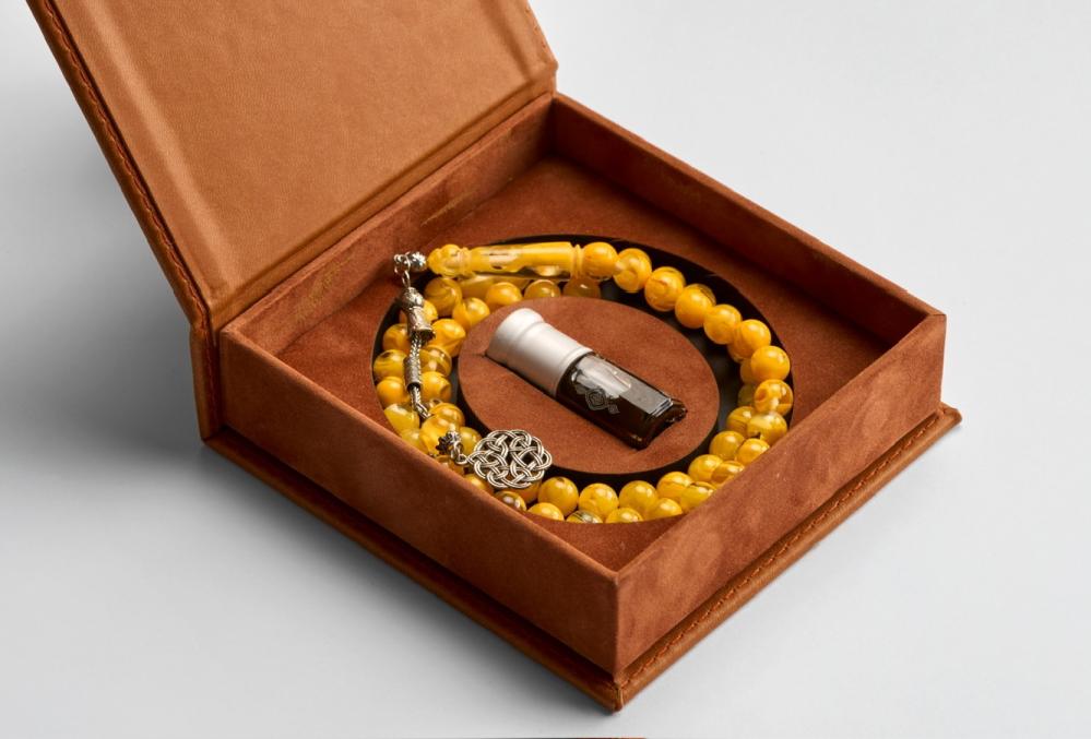 بوكس مصنوع من الجلد الايطالي الفاخر يحتوي على ( مسبحه باللون المتوفر - ربع توله من مخلط دهن العود )